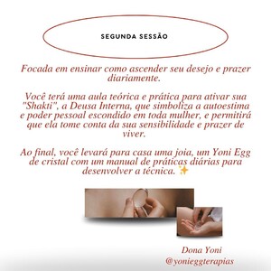 Ao final, você levará para casa uma joia, um Yoni Egg de cristal com um manual de práticas diárias para desenvolver a técnica.